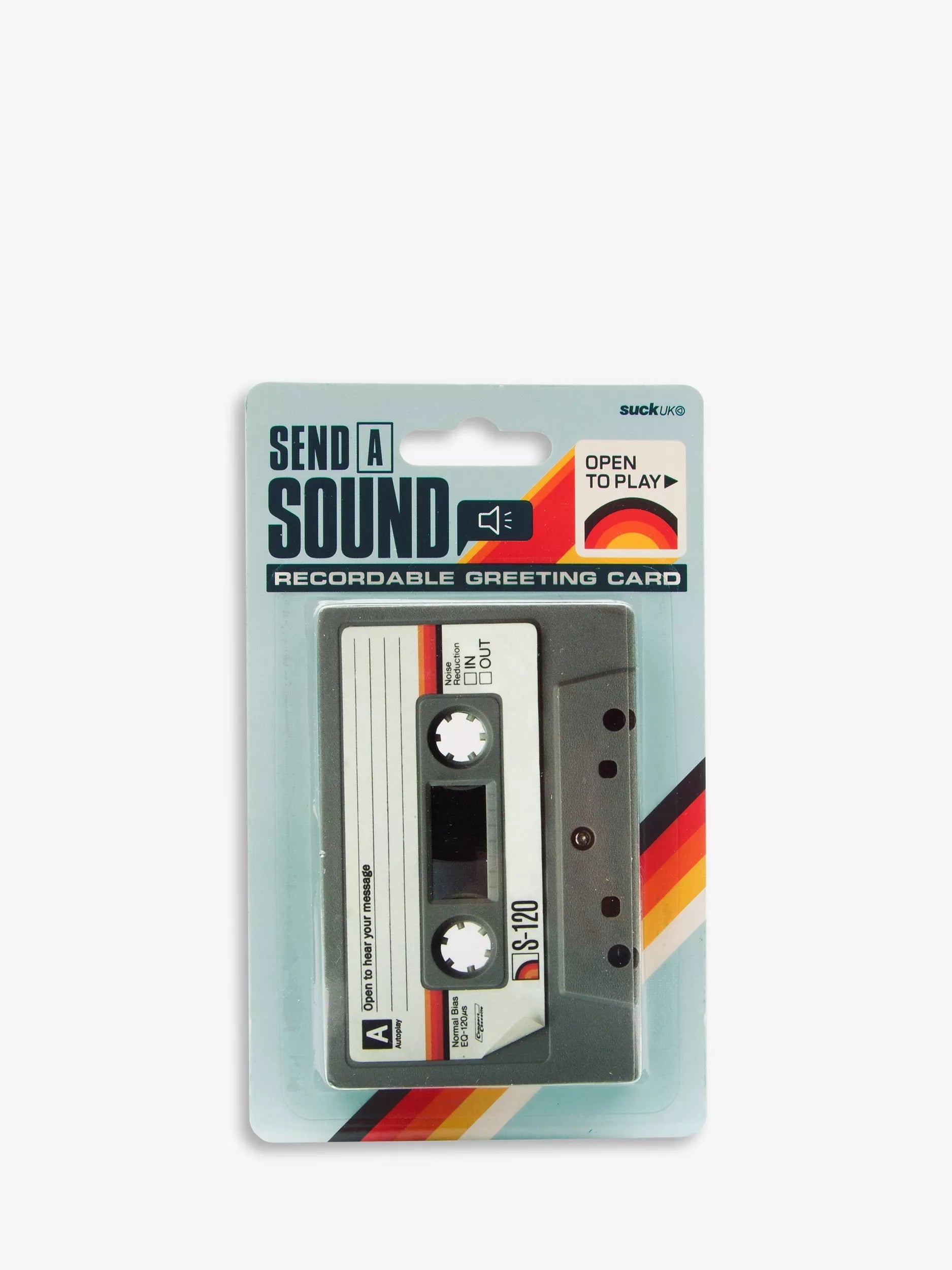 A cassette-tape-shaped greeting card for sending recorded messages to friends and family. When a hand written message doesn't quite cut it, send a sound recording in the form of a retro mixtape. Record for up to two minutes, handwrite a message, seal with the included sticker and send off to the lucky recipient. Your message will play automatically when the card is opened. A fun surprise to find in your letter box!