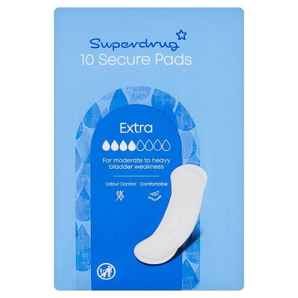 - same great absorbency. The Superdrug Secure Pads range has been specifically designed for protection against bladder weakness. We use our softest materials, for all day comfort as well as ensuring that any liquid and potential odours are absorbed quickly away from your skin and locked away.