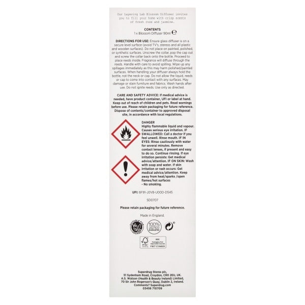 Enhance your home environment with the Superdrug Layering Lab Blossom Diffuser, offering a sophisticated and continuous fragrance experience. This 90ml diffuser set is designed to subtly scent your rooms using included diffusion reeds.