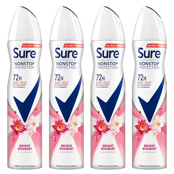 includes sure antiperspirant deo aerosol nonstop bright bouquet 250ml x 4