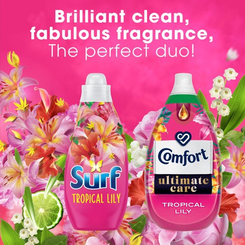 Read MoreOur Surf Tropical Lily Laundry Washing Liquid Detergent turns up the volume on joy in your day-to-day life, infusing your wardrobe with an explosion of floral sweetness that lasts from dawn to dusk. We've collaborated with top fragrance experts to bring you the joyful power of long-lasting tropical lily scent, infused with essential oils for up to 12 hours of in-wear delight. Our laundry detergent delivers a brilliant clean with a fabulous fragrance long after you've washed your clothes. You can rest assured your laundry will be brilliantly clean and fresh with this detergent from the UK's No.1 fragrance detergent brand*. Surf liquid laundry detergent is easy to use, being both efficient and convenient for your busy life. For best results, use 27 ml for standard loads (4/5 kg) and soft/medium water. For larger or dirtier loads and hard water, use 40 ml. Check care labels first and wash dark colours separately. Do not use on silk or wool.