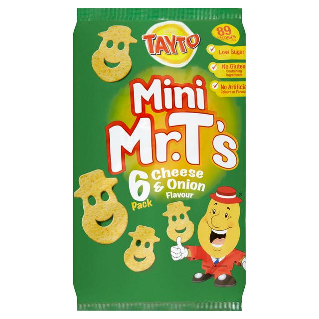 Tayto Mini Mr Ts provide a satisfying Cheese and Onion Flavour snack experience in a convenient multi-pack format. These distinctively shaped snacks use a blend of cassava, maize, and potato for texture. Each 17g single pack contains 89 calories, making them a useful component for packed lunches or portion control.