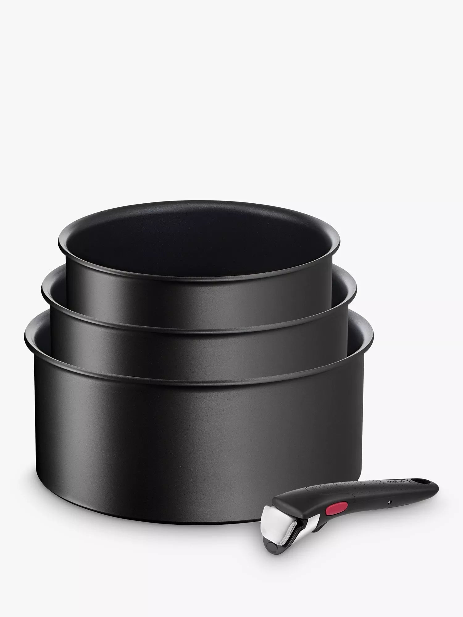 A lightweight non-stick saucepan set from the Tefal Ingenio range of cookware. This set includes three sizes: 16cm, 18cm and 20cm, plus an Ingenio removable handle for use with each pan and other Ingenio cookware.