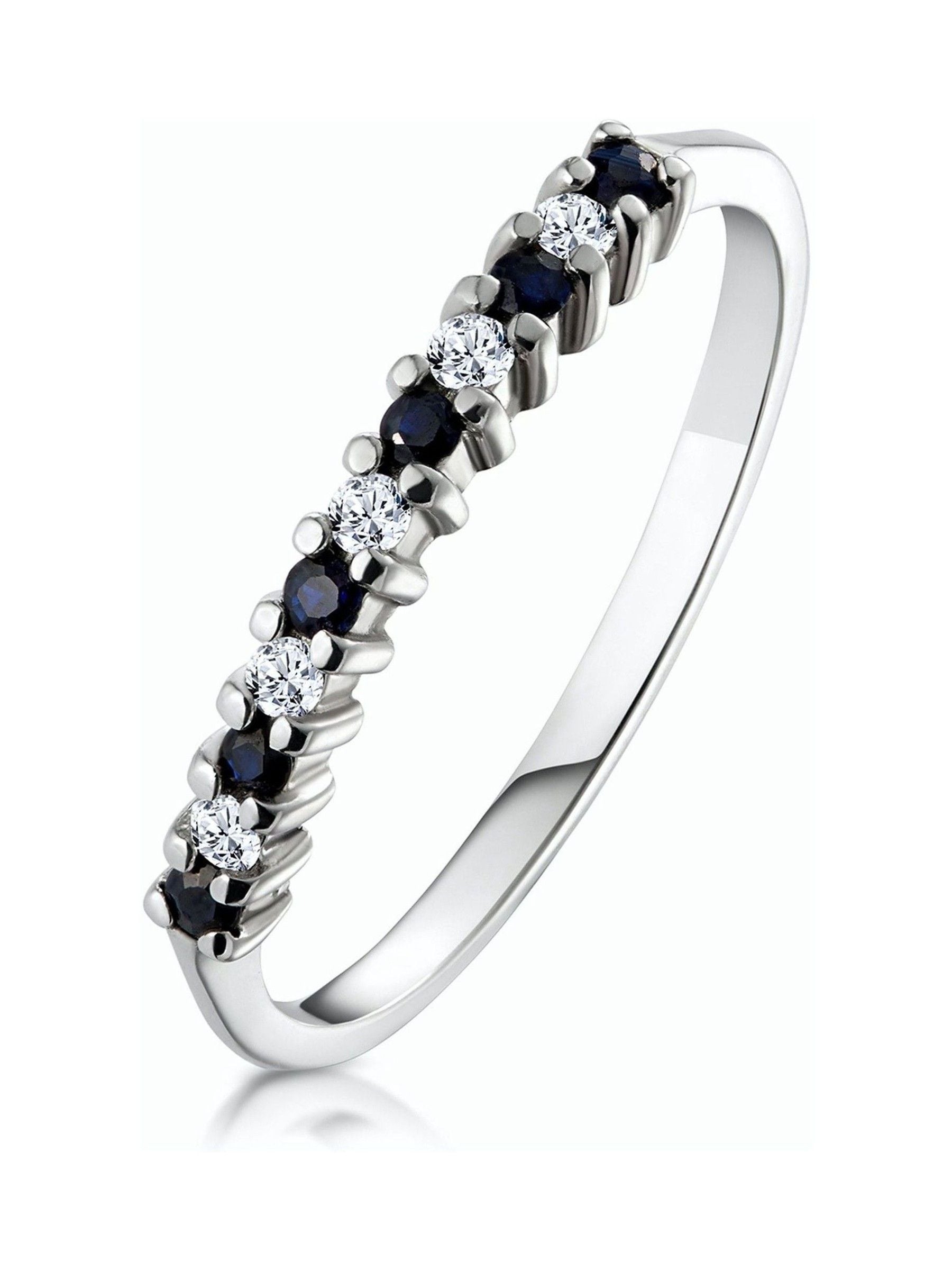 The white gold band and claw settings of this glamorous ring set the diamonds and sapphires off to a tee. This striking ring features 0.08CT of Premium Quality Diamonds and 0.10CT of sapphires which are interspersed throughout the design to create an exquisite result.