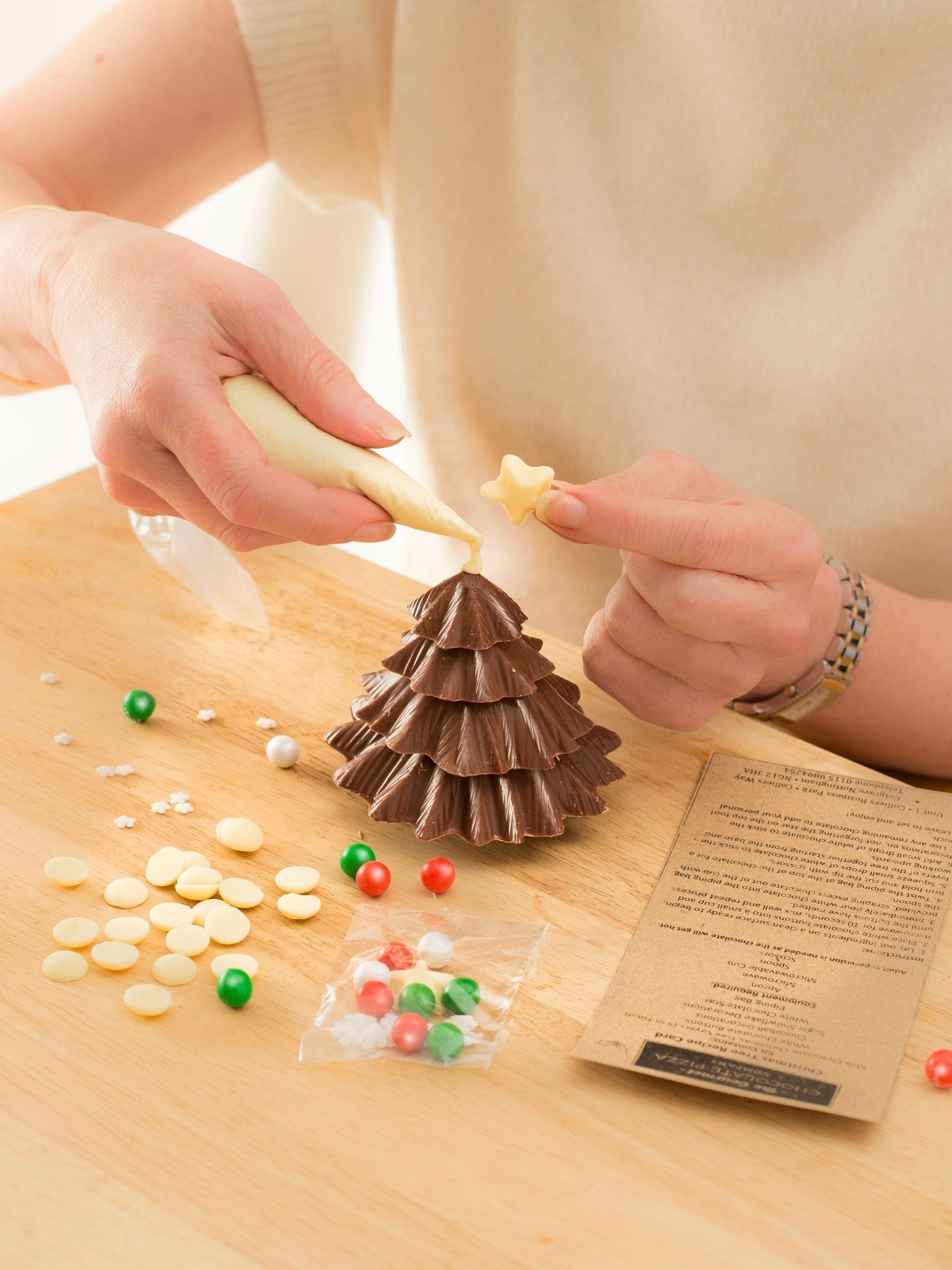 Making your own chocolate Christmas tree is so exciting, everything is included to have fun building your tree. Belgian milk chocolate branches with white chocolate to melt and create snowy branches, stick your decorations on too, and top the tree with a white chocolate star. Piping bag and instructions enclosed.