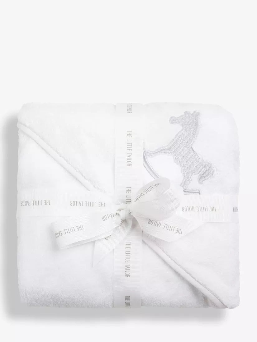 Keep baby snuggly and warm after bathtime with this super soft cotton hooded bath towel. Made from highly absorbent and quick drying terry towelling, with rocking horse embroidery on the hood. It comes ribbon wrapped, so makes an ideal gift.