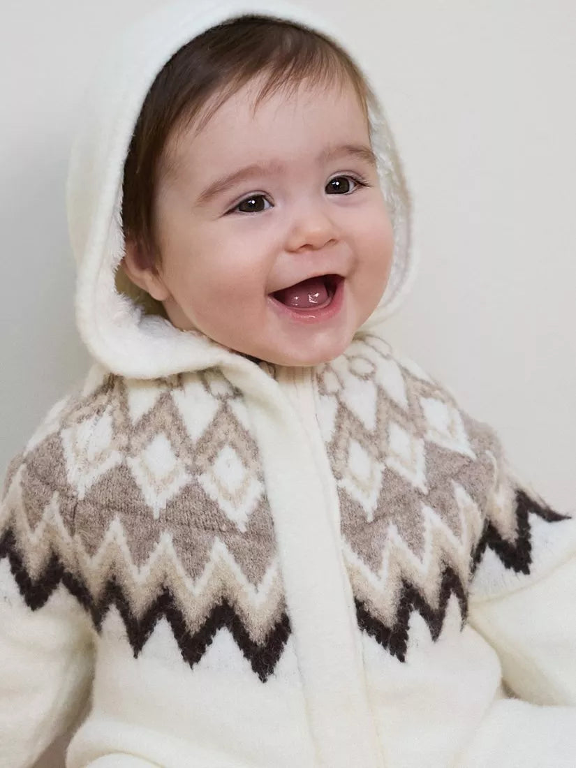 Keep your little one warm and cosy this autumn winter season with this luxury soft knitted fairisle pramsuit. With plush lining in the hood and a full jersey lining to the body there is no doubt that baby will be super comfortable and snuggly this season. This pramsuit features a front zip opening for easy access making it both stylish and practical.