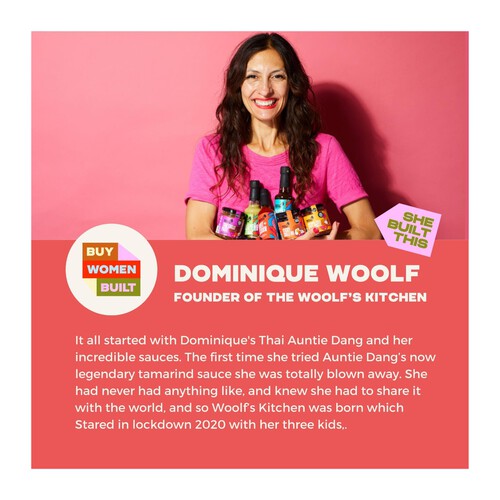 ABOUT: Created by Dominique Woolf, bestselling cookbook author and winner of The Great Cookbook Challenge TV show with Jamie Oliver, The Woolf’s Kitchen crafts award-winning, chilli oils, sauces, and spice pastes inspired by her Thai roots. Our easy-to-use flavour packed products will transport you across the globe and make every meal wilder.