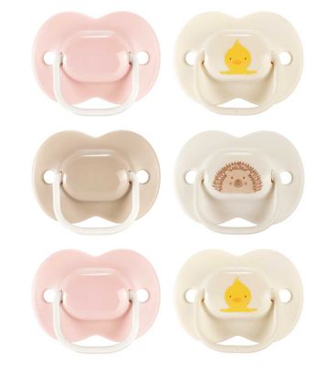 This six-pack of Tommee Tippee Anytime Soothers is thoughtfully designed for infants aged 0 to 6 months, presented in a soft pink neutral colourway. The symmetrical silicone teat is engineered so it will always be presented the correct way up when offered to your baby. These soothing aids prioritise comfortable wear and support healthy skin.