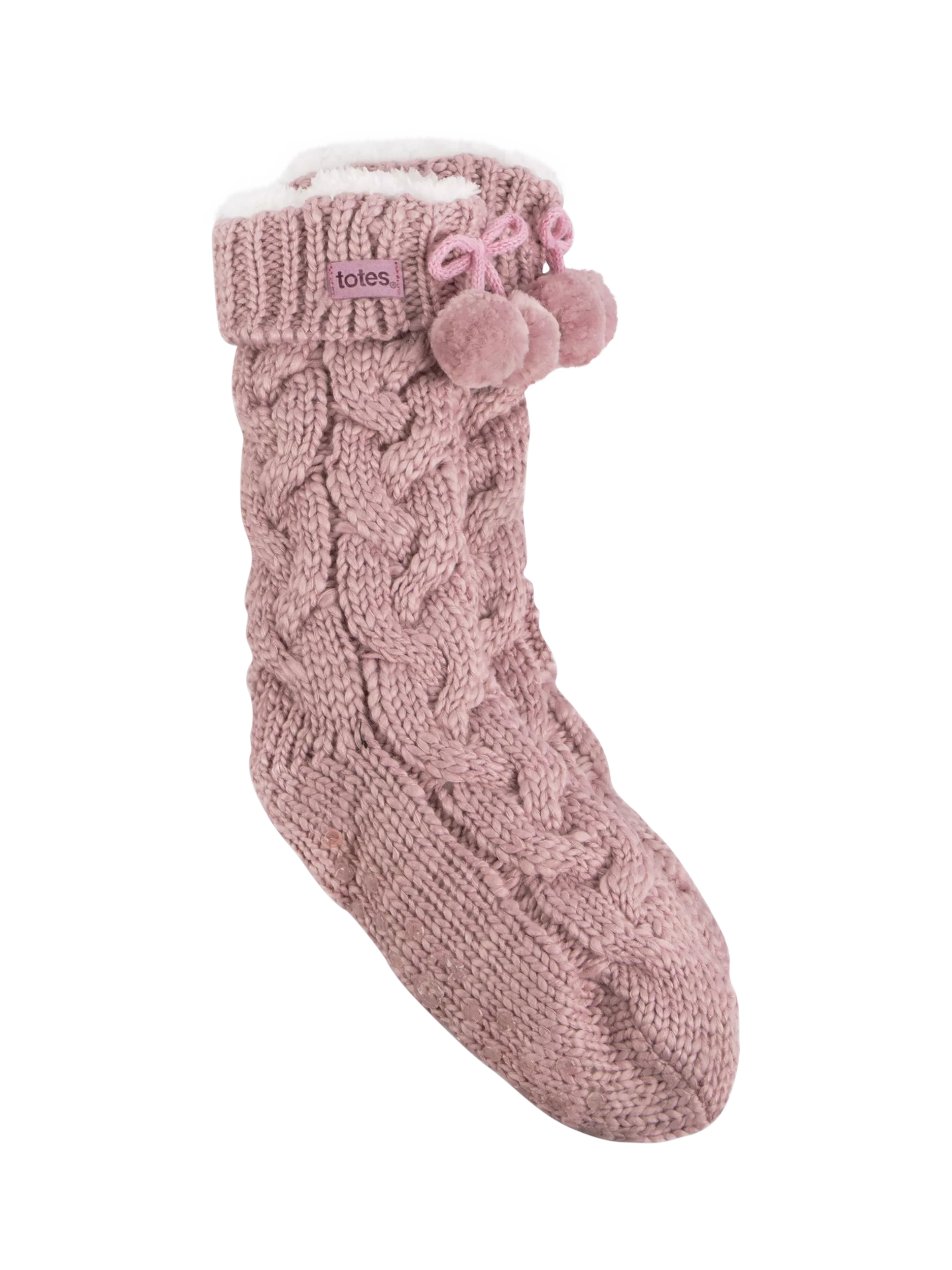 These lovely chunky cable knit totes toasties slipper socks ensure a perfect pairing with your cosy indoor winter wardrobe. The pompom tie detailing is a fun touch, and the sherpa lining guarantees warm feet for winter. The slip-resistant tread is a given, of course, and they also come beautifully packaged for the perfect gift.