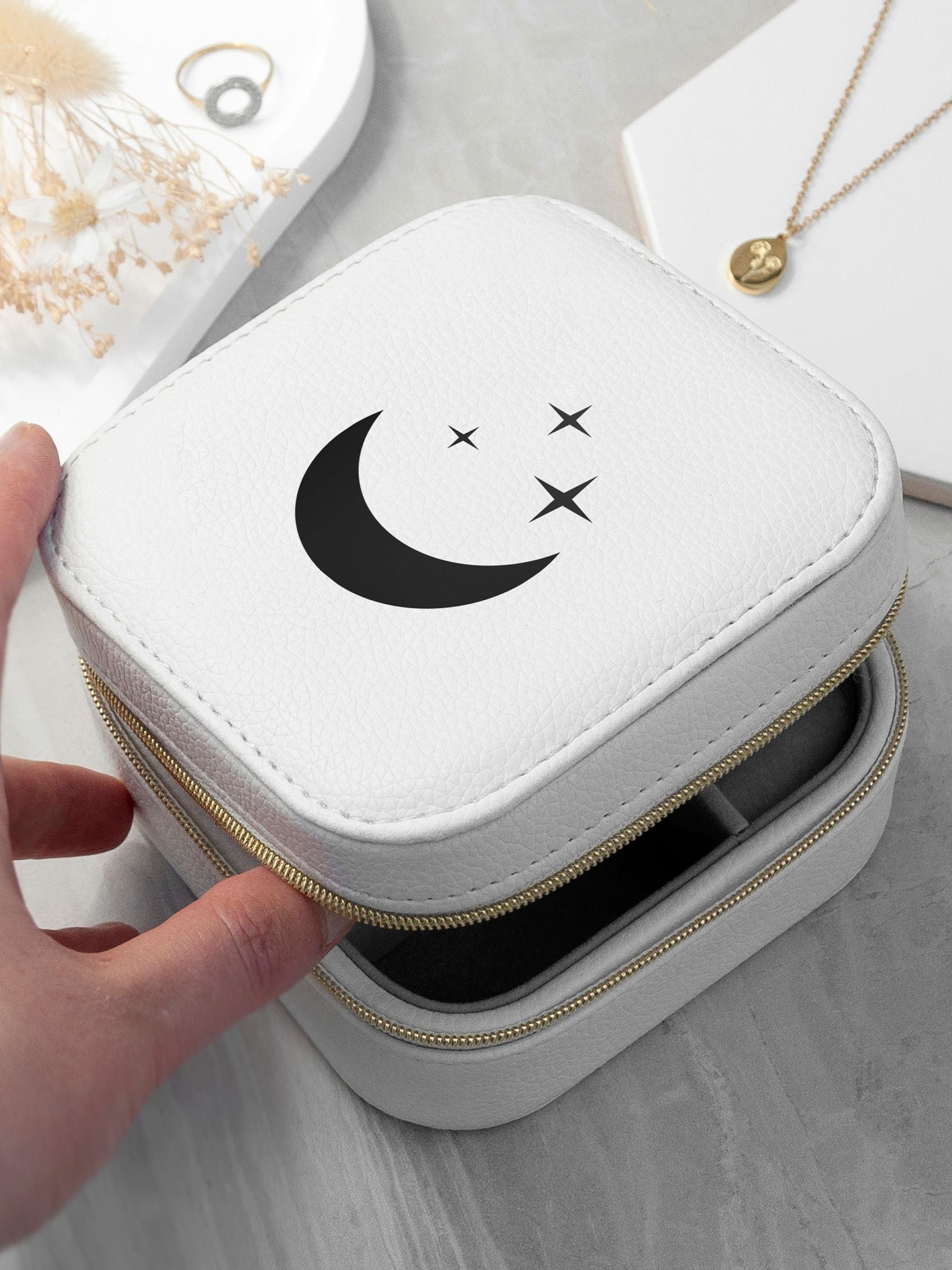 Elevate your travel look with our sensational Customisable Icon White Square Travel Jewellery Case - where elegance meets functionality. Durable, lightweight, and perfect for on-the-go adventures, this jewellery case has plenty of space for all her trinkets, accessories and jewellery essentials. In addition, the super soft velvet interior provides cushioning for her jewellery, ensuring they don’t get damaged even when she’s on her travels. The effortlessly stylish look of this jewellery case, with its sleek golden zip-around closure, means she’ll rarely want to be without it. It’ll be just as at home in her suitcase on holiday as it is on her dressing table at home - it truly is a versatile accessory. Select one of our stunnign celestial icons. Dimensions: 10.9cm x 10.8cm x 6.2cm.