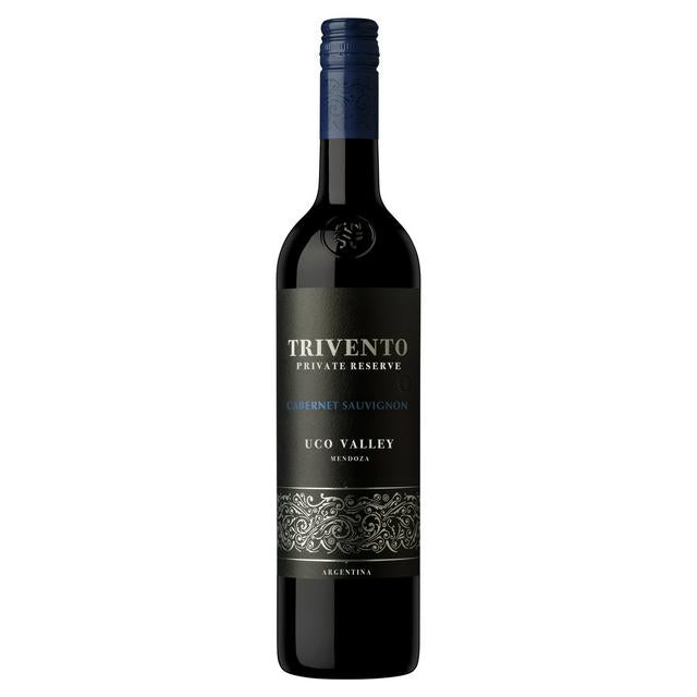 Product details Description Red Wine Suitable for vegans From the high altitudes of Mendoza's Uco valley at the foothills of the Andes, the rich ruby red Trivento Private Reserve Cabernet Sauvignon is fruity on the nose with spicy aromas. Aged for 8 months in oak barrels, the smoky notes on the palate balance velvety smooth tannins that evolve into a long, persistent finish. Certified B Corporation Tidyman Vegan Society Dietary Information Manufacturer Country of Origin Packaging Alcohol Customer ratingWe deliver to over 120 countries || Whilst certain products cannot be delivered outside UK, some products may be subject customs and excise duties || We confirm if this product can be delivered to your location (outside the UK) when you enter your delivery address at checkout. If you are unable to checkout, please contact us via WhatsApp or email hello@mcgrocer.com to enquire if this product can be delivered to your location and to process your order via our live chat.
