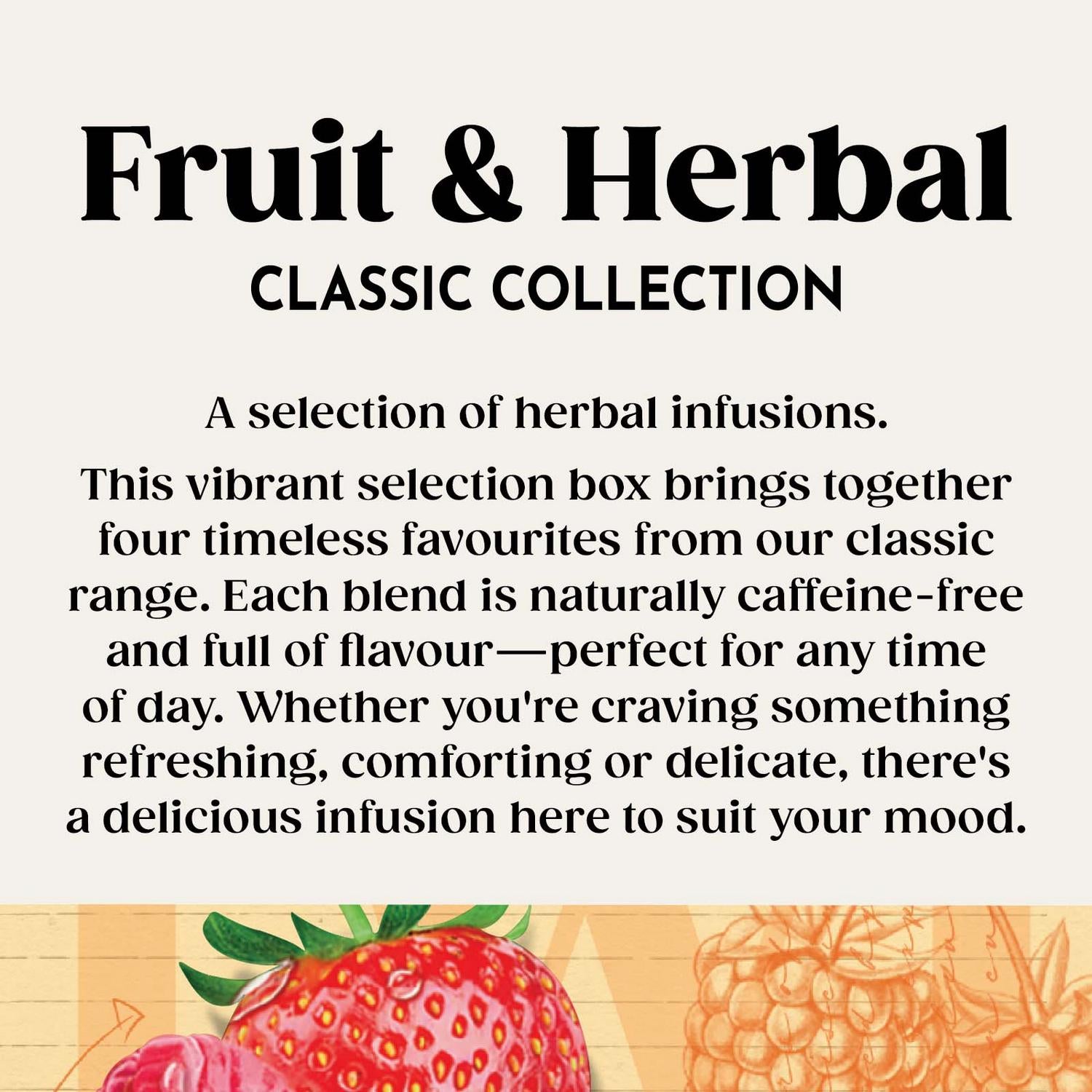 A selection of herbal infusions. This vibrant selection box brings together four timeless favourites from our classic range. Each blend is naturally caffeine-free and full of flavour—perfect for any time of day. Whether you're craving something refreshing, comforting or delicate, there's a delicious infusion here to suit your mood.
