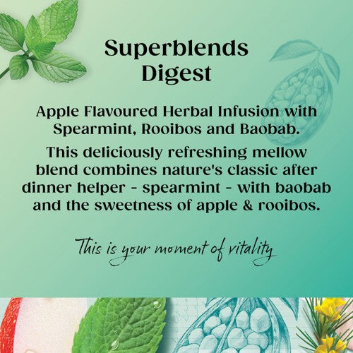 Feeling soothed and balanced is the inspiration behind this Digest blend. This deliciously refreshing mellow blend combines nature's classic after dinner helper-spearmint-with baobab and the sweetness of apple & rooibos.