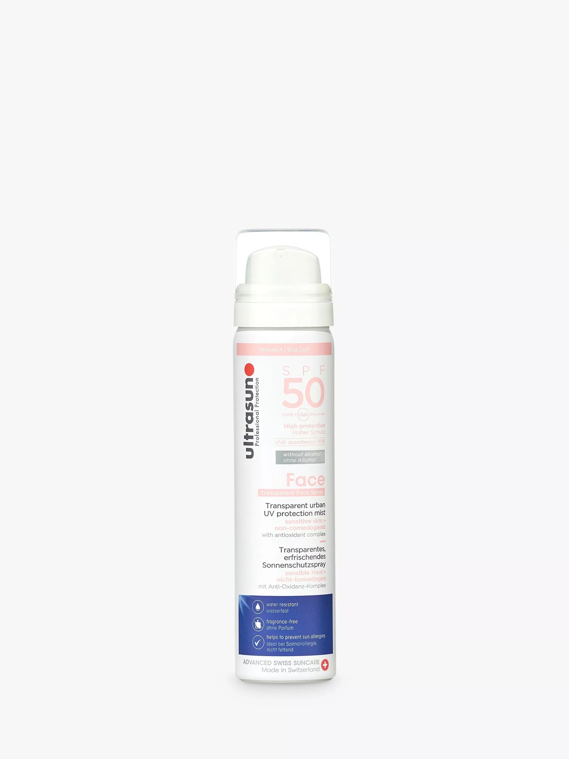 Ultrasun 50 SPF UV Face & Scalp Mist delivers high UVA and UVB broad spectrum protection in a super lightweight, easy, non-greasy, quick-drying transparent spray.