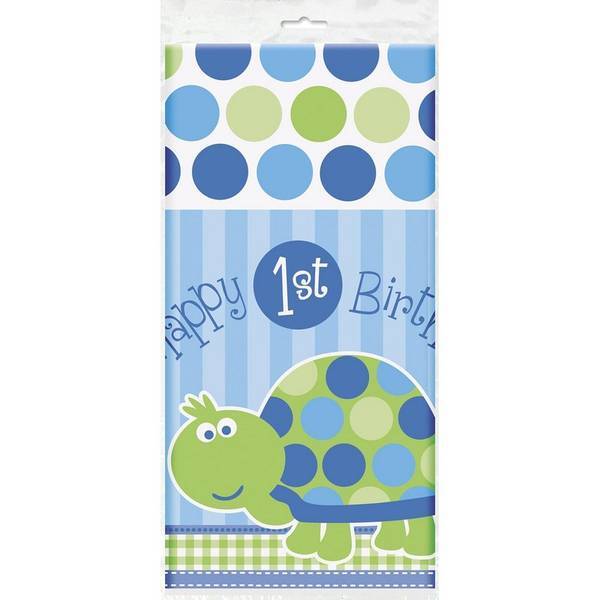 This Unique Party table cover is ideal for setting up a festive area for a first birthday celebration. Made from durable plastic material, it offers a simple solution for protecting surfaces from spills and messes. The design incorporates a cheerful turtle theme alongside popular patterns like polka dots and stripes.