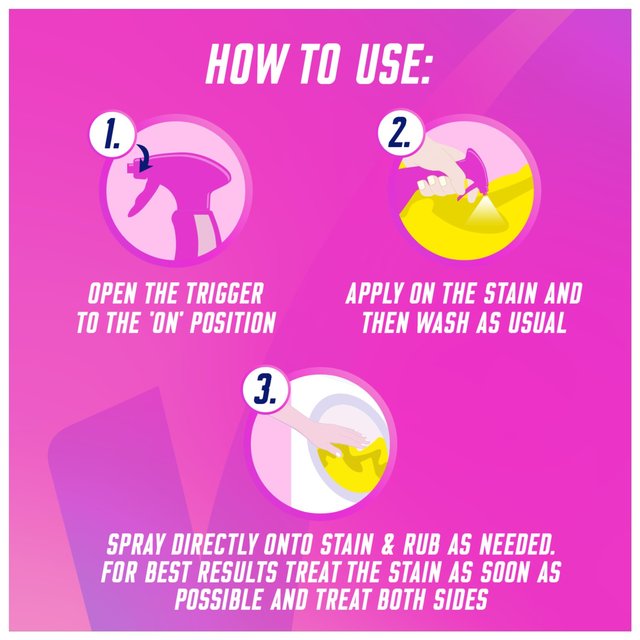 Vanish Oxi Action Spray is super-boosted and fast-acting. From the ones you can clearly see to the tougher ones that may be hidden deep in the fabric, providing astonishing results in as little as 30 seconds. You choose how to use this versatile stain remover spray; in wash, pre-treat or to soak your fabrics. Do not use on wool, silk, leather, finished or coated surfaces - for example wood and metal.