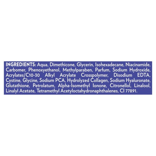 Aqua, Dimethicone, Glycerin, Isohexadecane, Niacinamide, Carbomer, Phenoxyethanol, Methylparaben, Parfum, Sodium Hydroxide, Acrylates/C10-30 Alkyl Acrylate Crosspolymer, Disodium EDTA, Cystine, Glycine, Sodium PCA, Hydrolyzed Collagen, Sodium Hyaluronate, Glutathione, Petrolatum, Alpha-Isomethyl Ionone, Citronellol, Linalool, Linalyl Acetate, Tetramethyl Acetyloctahydronaphthalenes, CI 77891