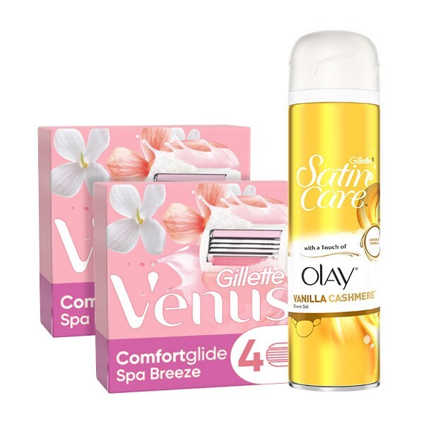 restock for your favourite shave with our venus spa breeze refill bundle includes 8 venus spa breeze blades and a vanilla cashmere shaving gel