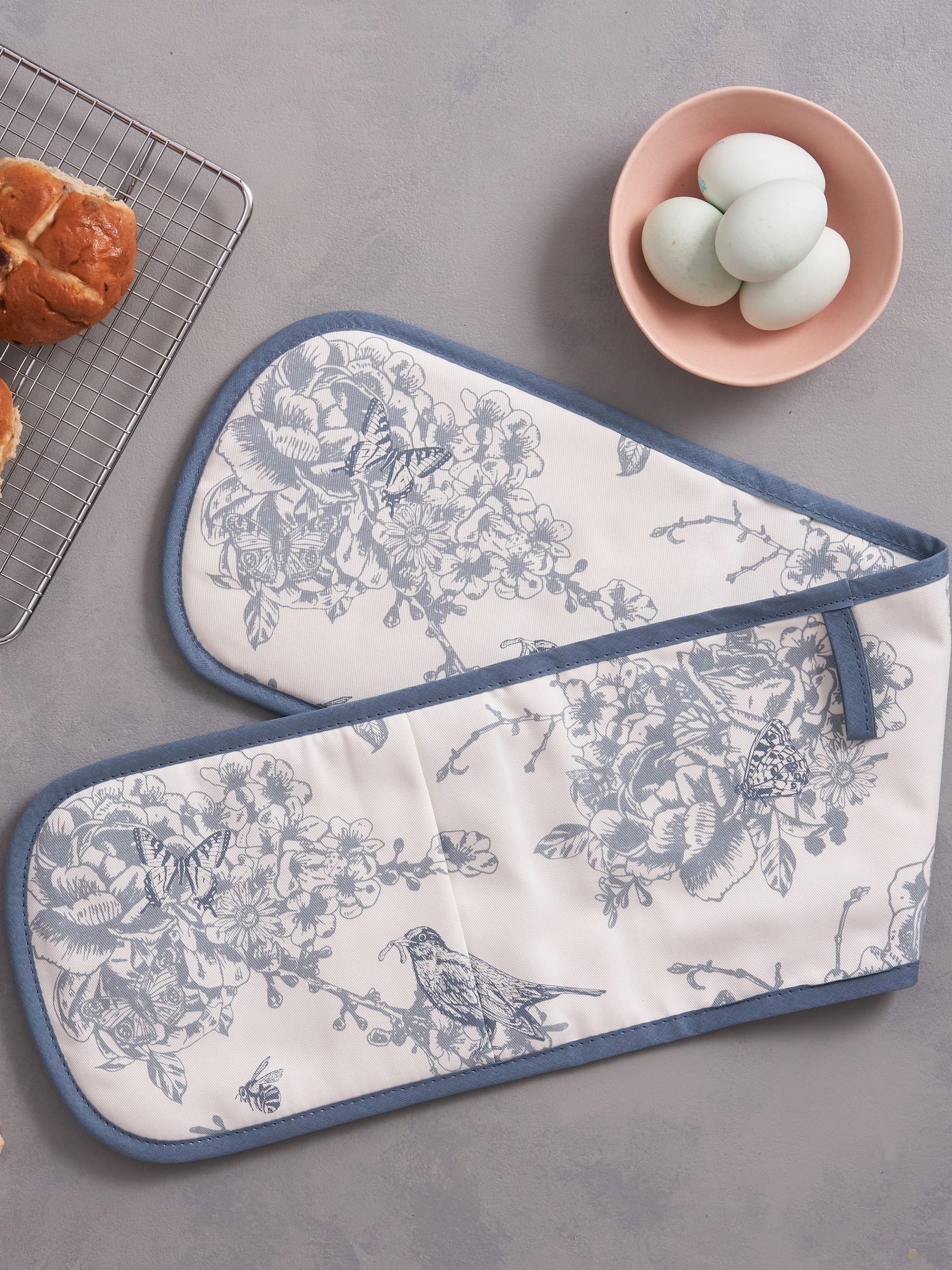 Inspired by the blossoms, butterflies and well-known birds of British Springtime, this cotton oven glove by Victoria Eggs invites wildlife into your kitchen and is sure to put a Spring in your step whilst serving up your next meal. Handmade in Britain, printed onto 100% cotton. Conforms to British Standards 6526:1998 (i.e. they really do protect your hands). Dimensions: approx 18 x 82cm.
