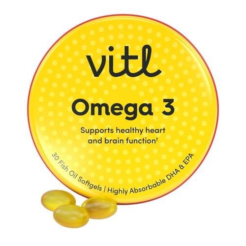 Vitl supplies 30 easy-to-swallow fish oil softgels containing the essential fatty acids DHA and EPA. This supplement is sourced responsibly and carries a sustainability certification from Friend of the Sea. These high-quality softgels are designed for easy daily integration into your routine.