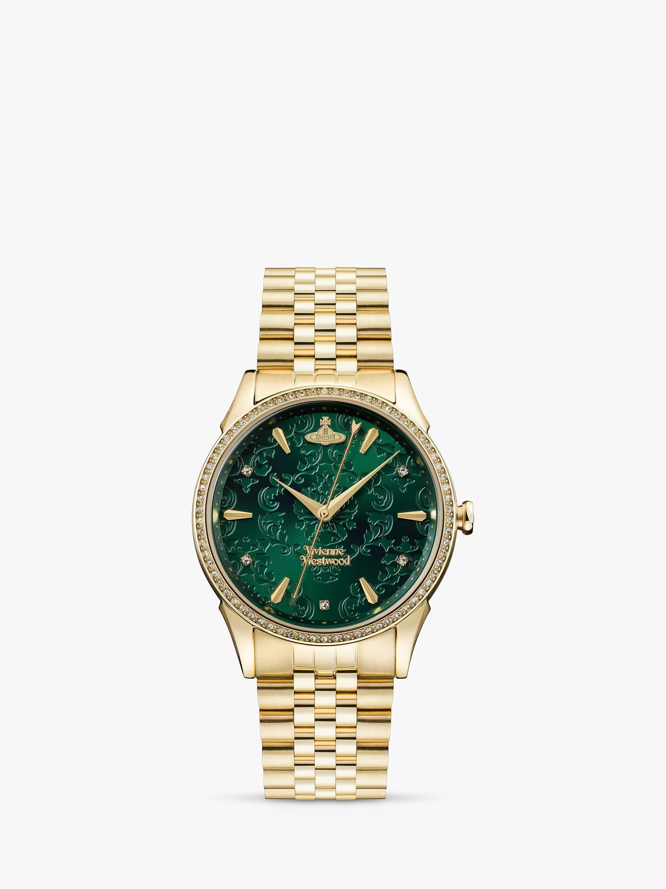 Emboldened with an intricately engraved dial decorated with sparkling Swarovski crystals, The Wallace from Vivienne Westwood is a statement timepiece. The polished stainless steel design further accentuates the style which is secured with a bracelet strap with a push-button fold-over clasp.
