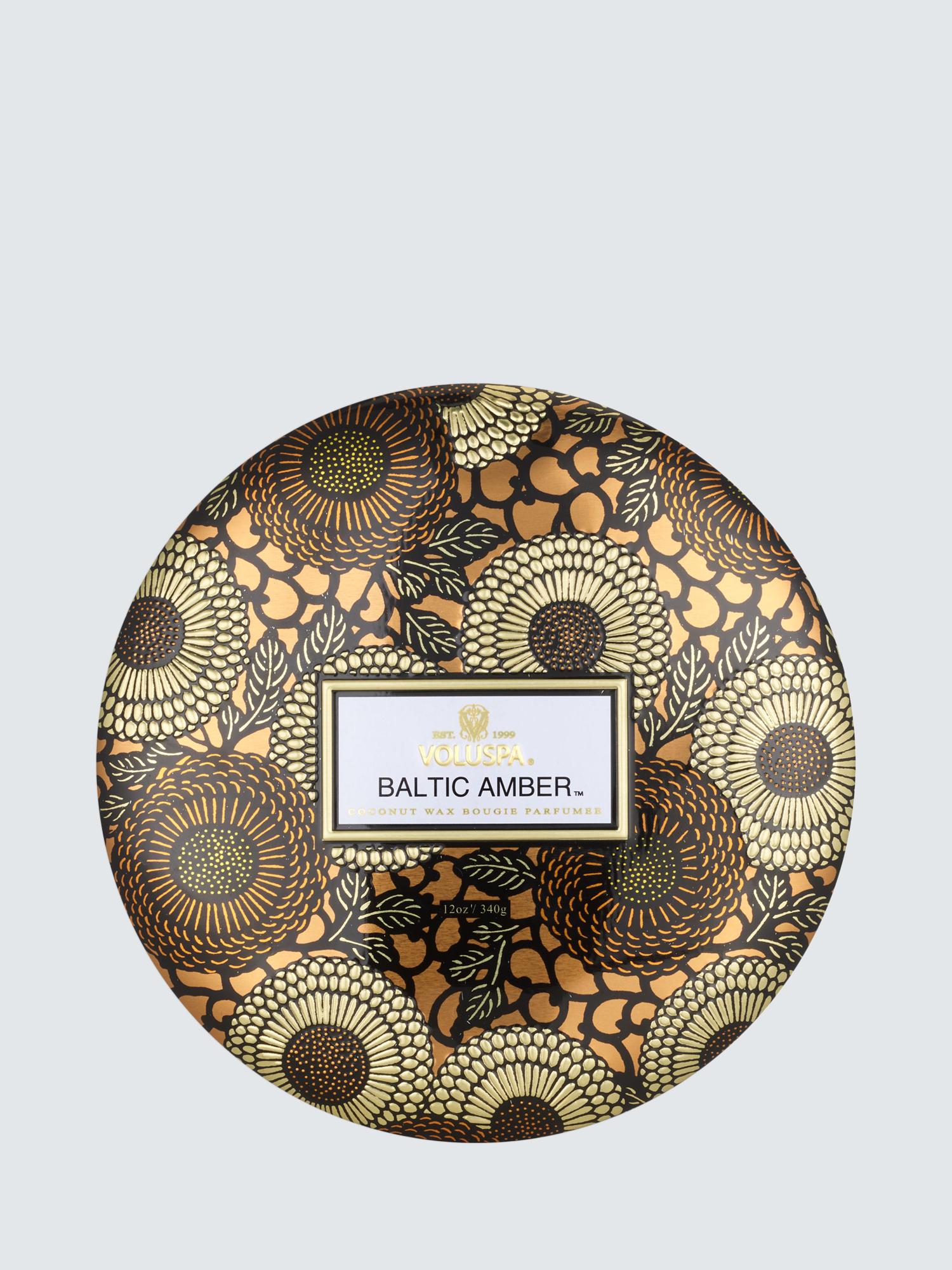 Voluspa Baltic Amber Three Wick Tin Candle 340G fills any room with its deeply warm and sensual fragrance profile, excellent for creating ambience right now. This luxurious 340G candle burns cleanly, releasing rich notes of honeyed Amber Resin, velvety Woods, and smoky Vanilla Orchid. It provides an enchanting golden glow.