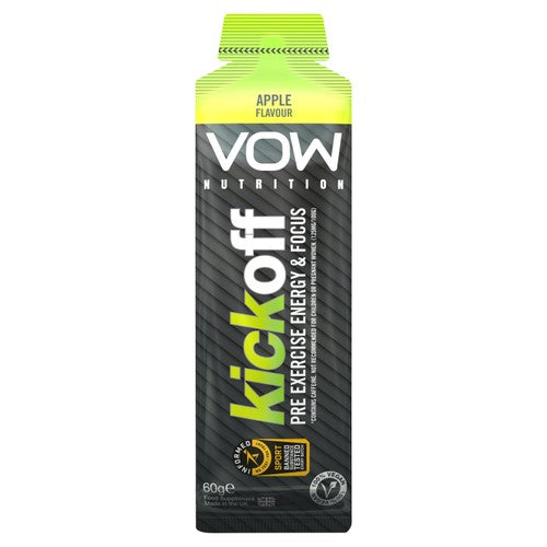The Vow Nutrition Kick Off Apple gel is formulated to supply readily available energy when you need it most during training or competition. This convenient gel delivers essential carbohydrates and a measured dose of caffeine to support immediate physical output and mental readiness. It is specifically designed to provide a beneficial boost right at the start of strenuous exercise.