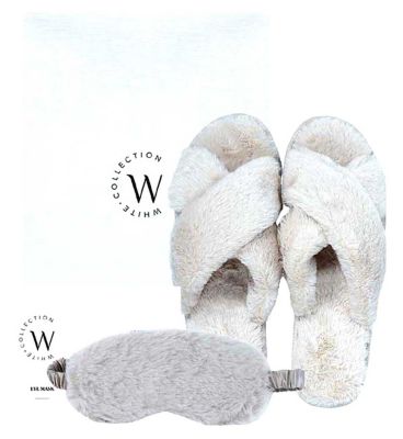This "W Collection White" set offers coordinated comfort for your relaxation time at home. It pairs soft, plush slippers with a matching eye mask for a complete unwinding experience. The neutral aesthetic makes this an ideal addition to your cosy essentials or a thoughtful present for someone special.