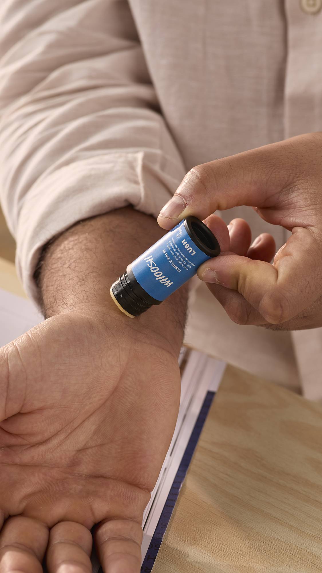 Apply directly to your temples and breathe in the awakening scent of grapefruit and rosemary oils. Try dabbing a little on your pulse points too, for a tiny burst of fragrance energy throughout the day!