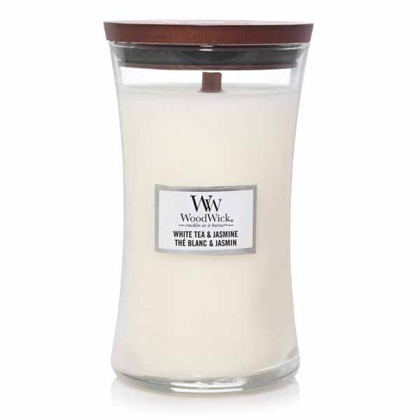 Enjoy the layered fragrance of WoodWick's White Tea & Jasmine candle, providing a fresh and floral tea aroma. This large 21.5oz offering comes in the signature hourglass shape for maximum aesthetic appeal throughout your home. It is designed specifically to fill your space evenly with a complex, relaxing scent profile.