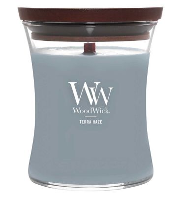 This WoodWick Medium Hourglass Candle offers a sophisticated scent experience enhanced by the distinctive sound of a natural wooden wick. It is designed to fill your space with fragrance while delivering a comforting, multi-sensory effect. Enjoy the specific fragrance profile of Terra Haze as it burns cleanly.