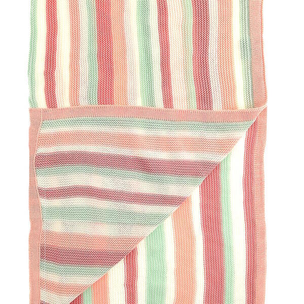 Read Moresoft pink white and green stripes in a breathable cotton knit rolled up with a ziggle ribbon perfect for gifts and adding a touch of warmth and colour to any nursery
